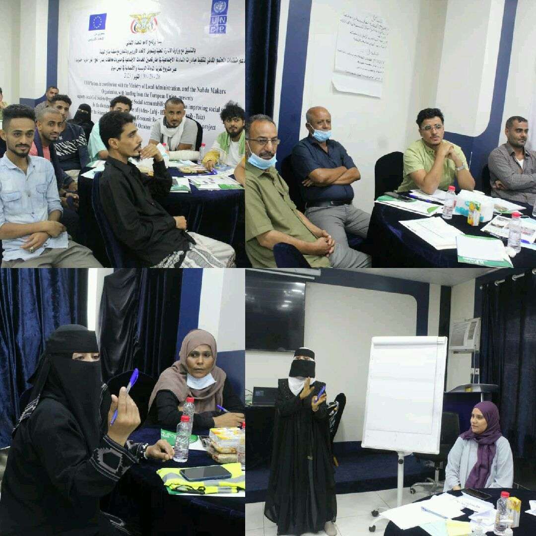 وذلك ضمن حقيبة التعاون المحلي في مشروع تعزيز المرونة المؤسسية والاقتصادية في اليمن من خلال نشاط دعم منظمات المجتمع المدني لتنفيذ مبادرات المساءلة الاجتماعية في اطار تحسين الخدمات الاجتماعية في مديريات محافظات عدن ، لحج ، تعز، مارب ، حضرموت ، الذي ينفذه برنامج الامم المتحدة الإنمائي بالتنسيق مع وزارة الإدارة المحلية وبتمويل الاتحاد الاوروبي بالتعاون مع منظمة صناع النهضة والذي يستمر لمدة ثلاثة ايام متواصلة بمشاركة (30) شخص من اللجان المجتمعية ائمة مساجد عمال الصندوق وشخصيات اجتماعية .