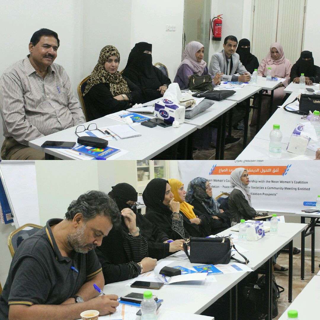 عقد صباح اليوم في مقر مؤسسة PASS اللقاء المجتمعي بعنوان أفق التحول الديمقراطي لما بعد الصراع بتنفيذ التكتل النسوي الجنوبي بالشراكة مع تكتل نون النسوي ومؤسسة PASS سلام لمجتمعات مستدامة في محافظة عدن استمر ليوم واحد بمحافظة عدن.