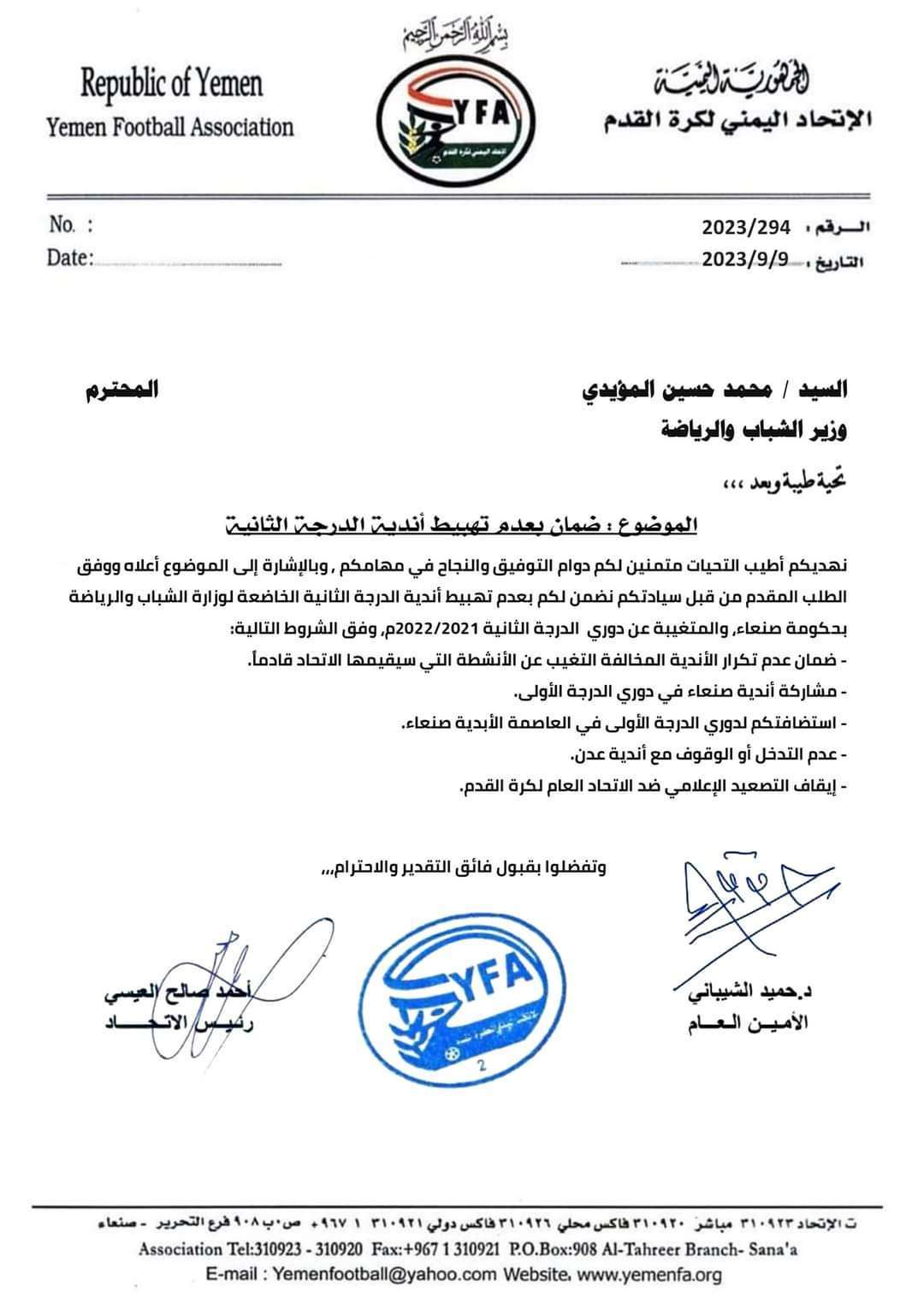 وتنازل العيسي في الوثيقة عن تهبيط أندية صنعاء التي قامت بمقاطعة دوري الدرجة الثانية مقابل استضافة الحوثيين لدوري الدرجة الأولى وعدم وقوف الأندية مع أندية عدن التي قرر اتحاد العيسي تهبيطها للدرجة الثانية.