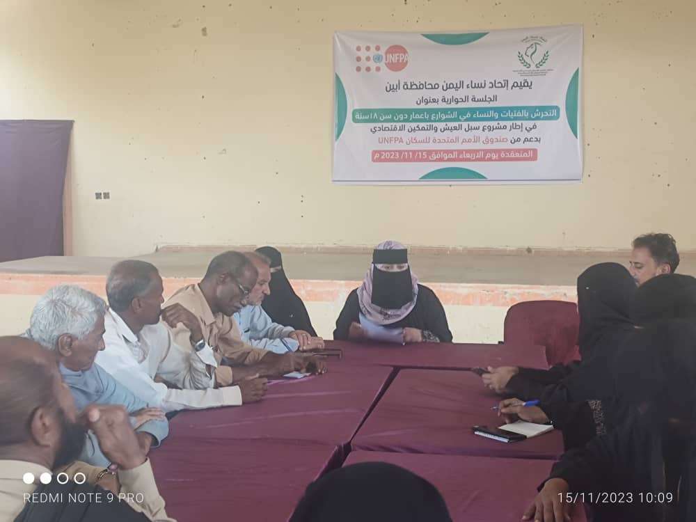 أقام اتحاد النساء فرع محافظة أبين يوم الأربعاء في قاعة اتحاد النساء بعاصمة محافظة أبين مديرية زنجبار جلسة حوارية بعنوان التحرش بالفتيات والنساء في الشوارع باعمار دون سن 18 سنة وذلك في إطار مشروع توفير سبل العيش والتمكين الاقتصادي الذي ينفذه اتحاد النساء بدعم من صندوق الأمم المتحدة للسكان UNFPA بمشاركة من الجهات ذات العلاقة .