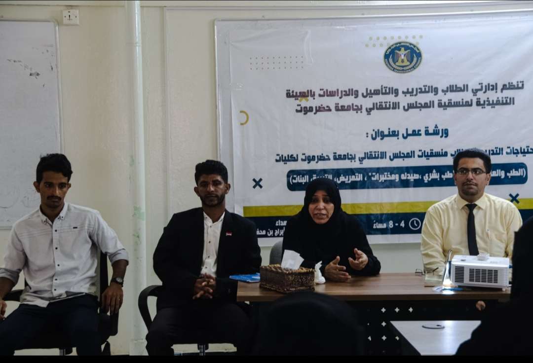 نظمت إدارة الطلاب بمنسقية المجلس الانتقالي الجنوبي بجامعة حضرموت بالتعاون مع إدارة التدريب والتأهيل والدراسات بالمنسقية، يوم الخميس، ورشة عمل بعنوان: "الاحتياجات التدريبية" لأعضاء هيئاتها التنفيذية بكليات الجامعة.