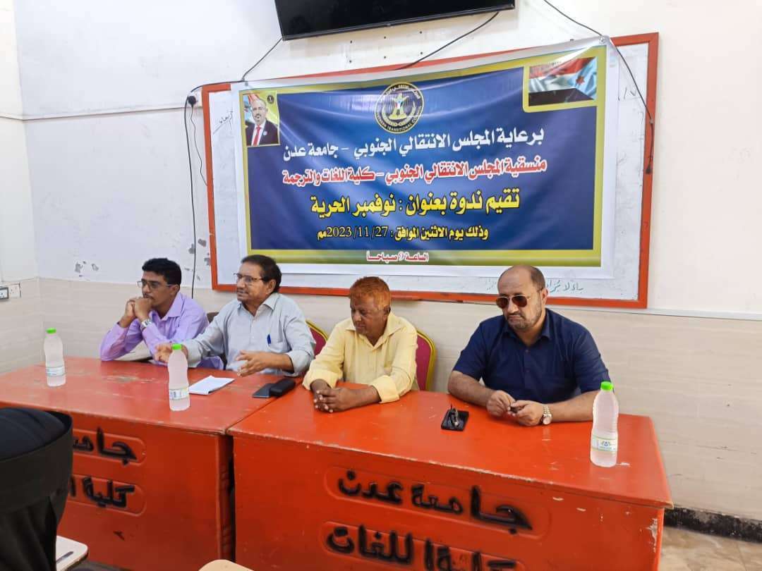 نظمت منسقية المجلس الانتقالي الجنوبي في كلية اللغات والترجمة بجامعة عدن، يوم الاثنين، ندوة بعنوان: "نوفمبر الحرية" تزامناً مع احتفالات شعب الجنوب بالذكرى الـ56 لعيد الاستقلال الوطني 30 نوفمبر.