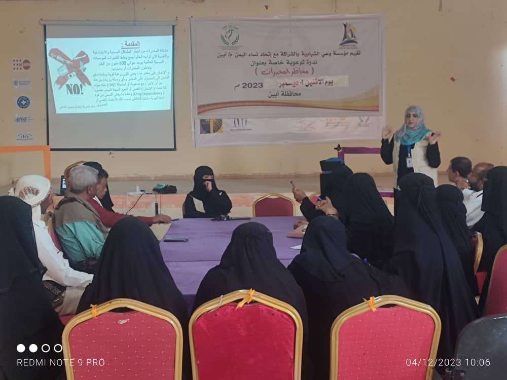 بالشراكة مع اتحاد النساء فرع محافظة أبين أقامت مؤسسة وعي الشبابية ندوة توعوية خاصة بعنوان "مخاطر المخدرات" والتي أقيمت في قاعة اتحاد النساء بمقر الاتحاد بعاصمة محافظة أبين مديرية زنجبار بحضور الأمين العام للمجلس المحلي بمديرية زنجبار الاستاذ غسان شيخ فرج الكثيري وبمشاركة 30 مشارك ومشاركة يمثلوا السلطة المحلية والأمن ومنظمات المجتمع المدني وناشطين بهدف زيادة مستوى الوعي من مخاطر المخدرات بسبب انتشار المخدرات وكثرة تعاطيها بين أوساط الشباب في المجتمع .