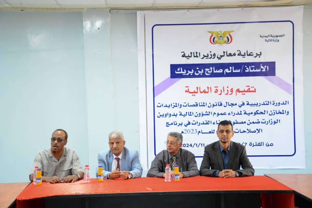 بدأت في العاصمة عدن، اليوم، دورة تدريبية في مجال قانون المناقصات والمزايدات والمخازن الحكومية، تنظمها وزارة المالية ضمن مصفوفة بناء القدرات في برنامج الإصلاحات المالية.