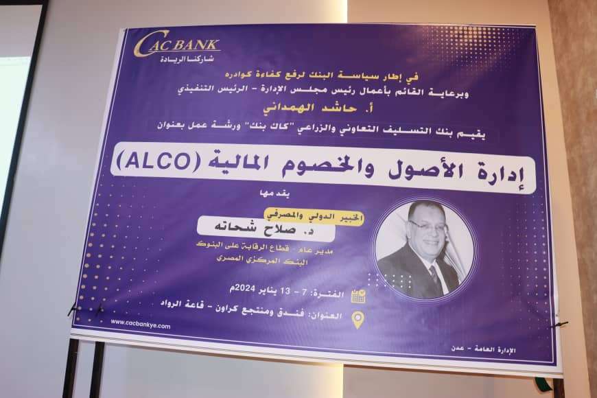 دشن بنك التسليف التعاوني والزراعي "كاك بنك" اليوم ، ورشة عمل بعنوان "ادارة الأصول والخصوم المالية (ALCO)"،في إطار سياسة البنك لرفع مستوى أداء كوادره و برعاية من القائم بأعمال رئيس مجلس الإدارة الرئيس التنفيذي للبنك الأستاذ حاشد الهمداني.