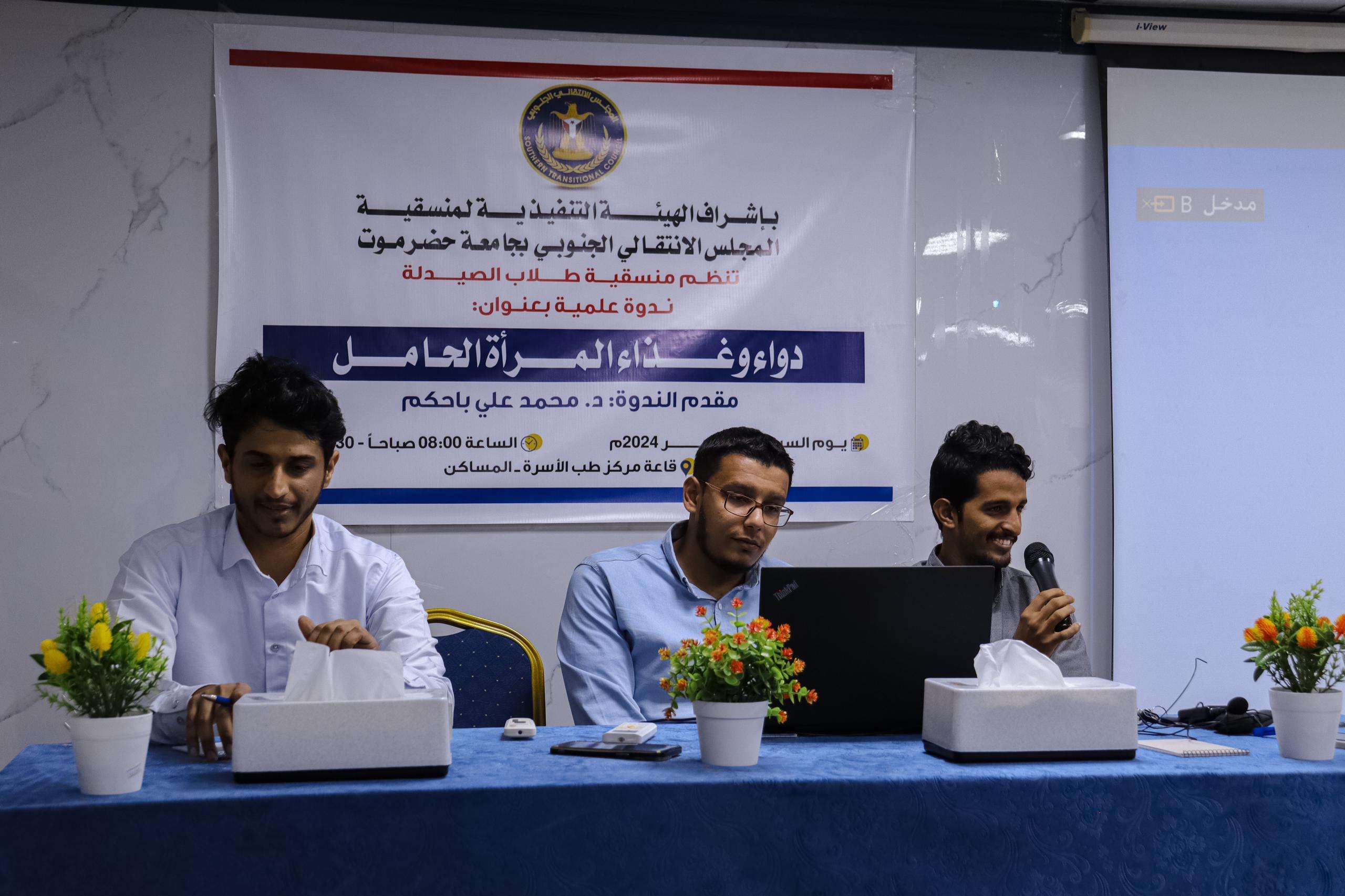 نظمت منسقية المجلس الانتقالي الجنوبي في كلية الصيدلة بجامعة حضرموت، يوم السبت، ندوةً علميةً بعنوان: "دواء وغذاء المرأة الحامل".