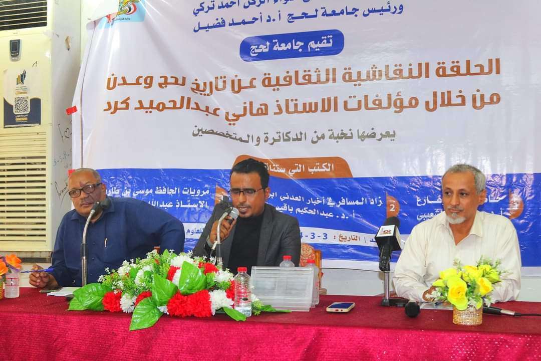 وتناول كل من أ.د. عبدالفتاح الشعيبي عميد كلية صبر للعلوم والتربية .. وأ.د عبدالحكيم باقيس والاستاذ عبدالله صالح الشيخ.. الكتب المؤلفة من الكاتب " هاني كرد " وتم عرض ما احتوته المؤلفات من معلومات تاريخية عن لحج وعدن واعلامها وكتابها وشخصياتها من الفقهاء وأهمية المعلومات ومصادرها ، كما تم عرض ومناقشة الإيجابيات التي وردت بالمؤلفات وأهمية اعتمادها في الدراسات والبحوث .
