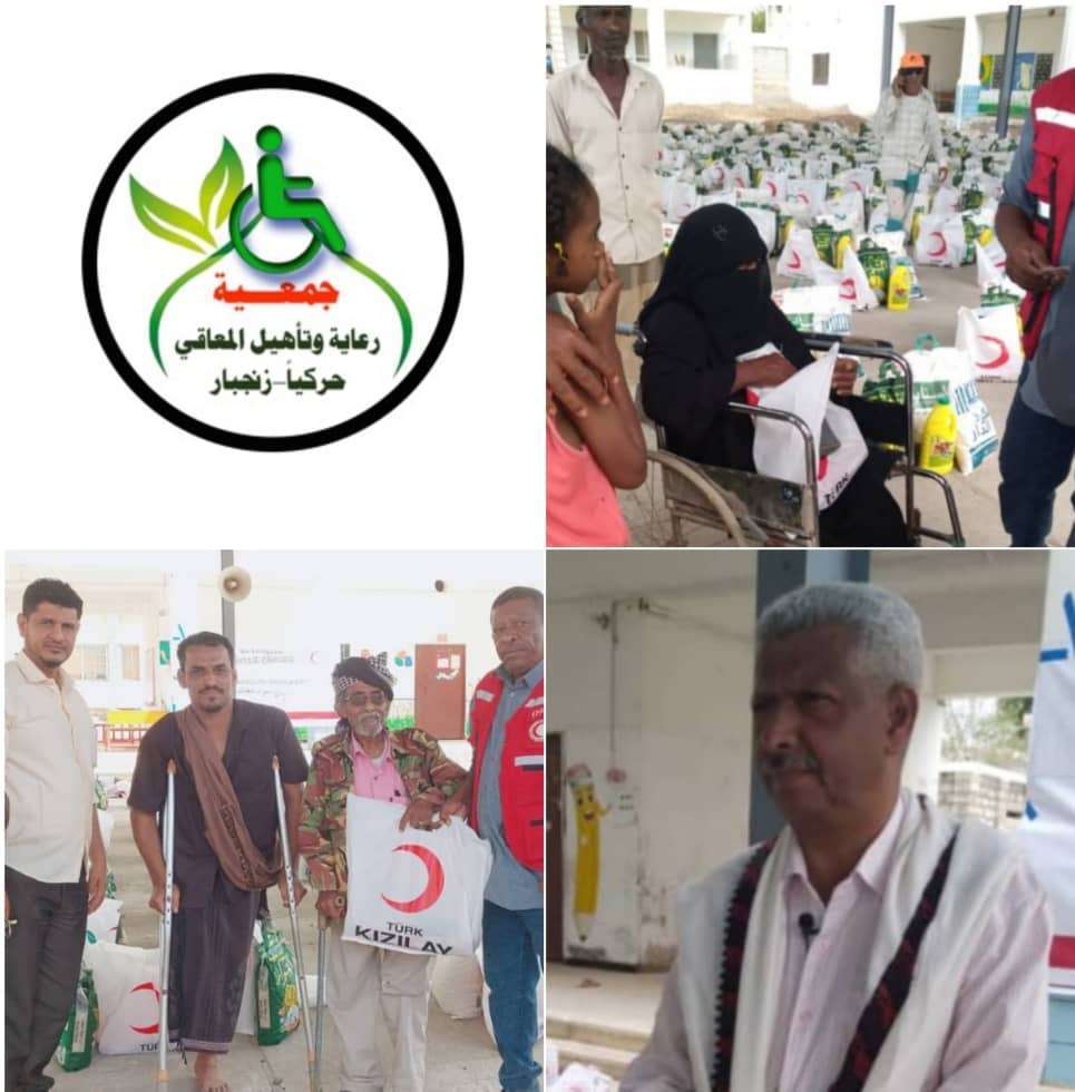 بدعم من الهلال الاحمر التركي وزعت جمعية الهلال الاحمر اليمني فرع محافظة أبين ” عدد (200) سلة غذائية للمعاقين حركياً بمدينة زنجبار بحضور الامين العام للمجلس المحلي مديرية زنجبار الاستاذ غسان شيخ فرج