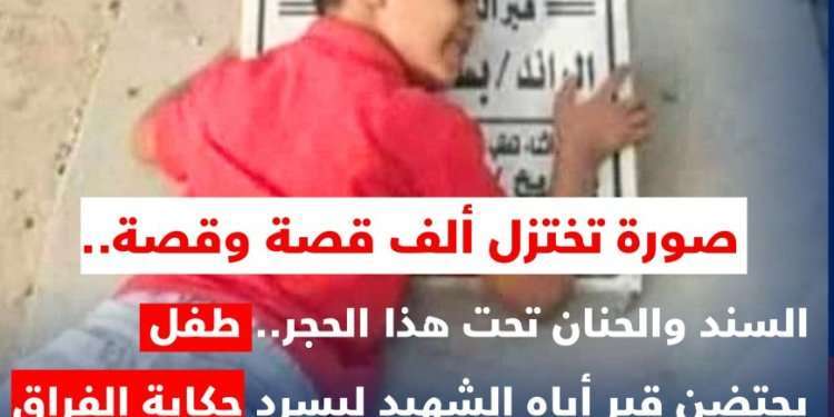 صورة تلخص ألف قصة. طفل صغير يتمطى فوق قبر والده الشهيد، يحتضن القبر، ويضع خده برفق على اللوحة التي تحمل اسم والده، في لحظة مؤثرة تحكي قصص فراق وألم وفخر في الوقت نفسه.