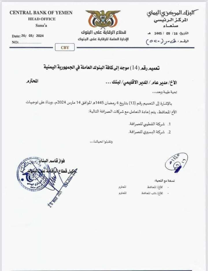 وجاء في التعميم الجديد، الذي حمل الرقم (14) ووجه إلى كافة البنوك العاملة في الجمهورية اليمنية، أنه "بناءً على توجيهات الأخ المحافظ، يتم إعادة التعامل مع شركات الصرافة التالية: