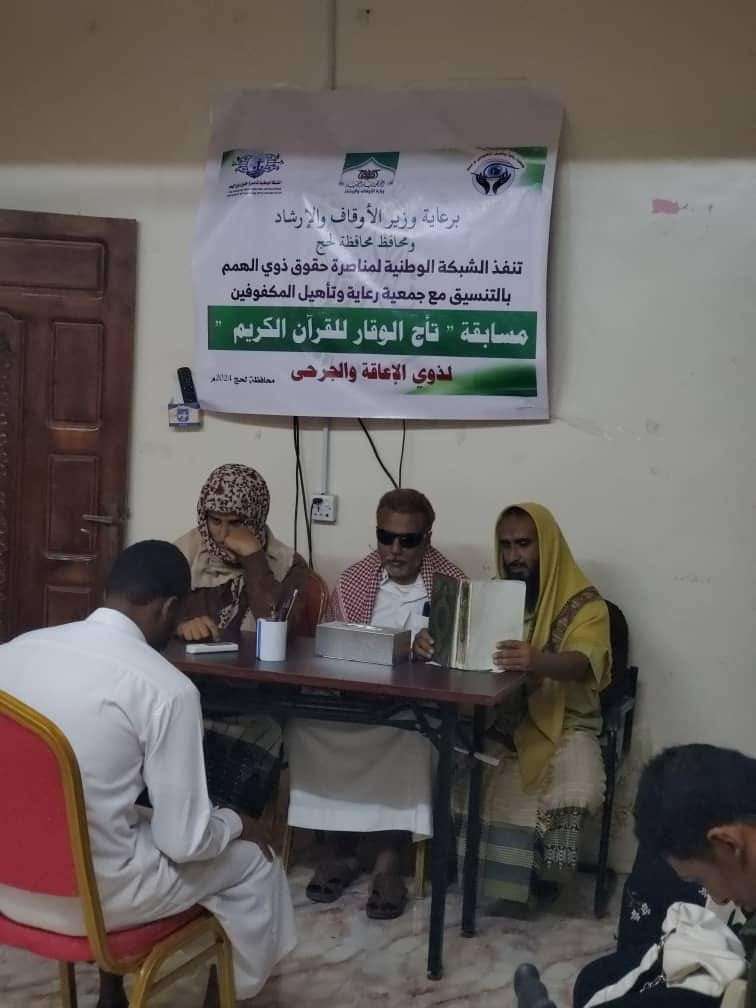 برعاية وزير الأوقاف والإرشاد .. تم اختتام من مسابقة " تأج الوقار للقرآن الكريم " لذوي الإعاقة والجرحى في محافظة لحج بتنفيذ من الشبكة الوطنية لمناصرة حقوق ذوي الهمم وجمعية رعاية وتأهيل المكفوفين