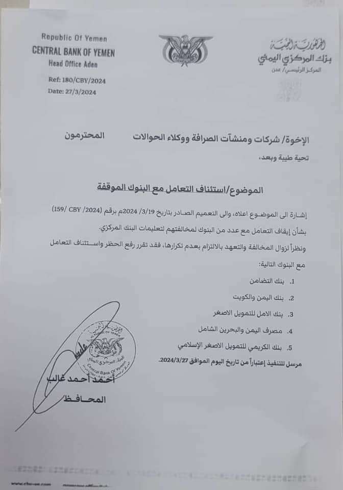 أعلن البنك المركزي اليمني عدن اليوم عن استئناف التعامل مع خمسة بنوك تم إيقافها مؤخرًا لمخالفتها تعليمات البنك.