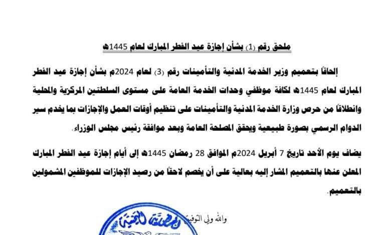 أعلنت وزارة الخدمة المدنية والتامينات في العاصمة عدن، موعد بدء إجازة عيد الفطر المبارك للعام الهجري 1445، لكافة موظفي وحدات الخدمة العامة على مستوى السلطتين المركزية والمحلية.