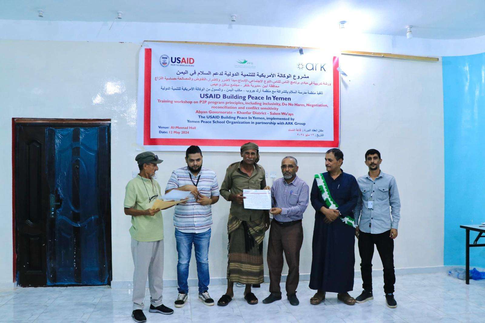 اختتمت منظمة مدرسة السلام بالشراكة مع منظمة "آرك - مكتب اليمن"، وبتمويل من الوكالة الأمريكية للتنمية الدولية، برنامج تدريبي حول مبادي برنامج الناس للناس، النوع الاجتماعي، الادماج، مبدأ لاضرر ولا ضرار، التفاوض والمصالحة وحساسية النزاع. في محافظة أبين، بالتحديد في مديرية خنفر بمجتمع ساكن وعيص.