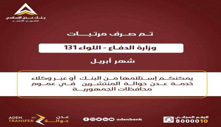 وأعلن بنك عدن الإسلامي صرف مرتبات اللواء 131، ولواء 115، ولواء باب المندب.