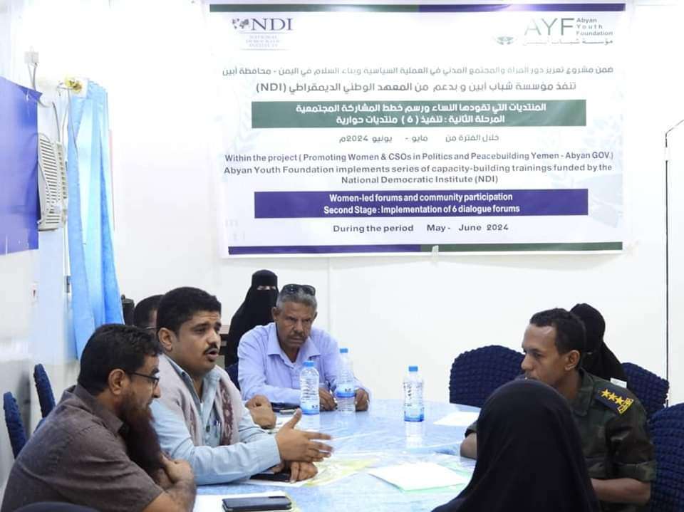 يأتي هذه النشاط ضمن مشروع تعزيز دور المرأة والمجتمع المدني في العملية السياسية وبناء السلام في اليمن الذي يقام بدعم من المعهد الوطني الديمقراطي ( NDI ) بنسختها الرابعة بمشاركة (6) منتديات تقودها النساء في اليمن تهدف إلى رسم الخطط المشاركة المجتمعية.