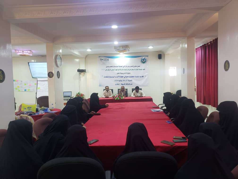 دشنت مؤسسة الشباب الديمقراطي بمحافظة شبوة" صباح اليوم، الدورة التدريبية الثالثة الخاصة "بتحديد أولويات المجتمع ودمجها في خطط الأحزاب السياسية والمنظمات" لعدد 20 مشاركة من مديرية نصاب، وتأتي هذه الدورة في إطار مشروع "تعزيز دور المرأة في العملية السياسية والمجتمع المدني" والذي تنفذة المؤسسة، بالشراكة مع "المعهد الوطني الديمقراطي NDI".