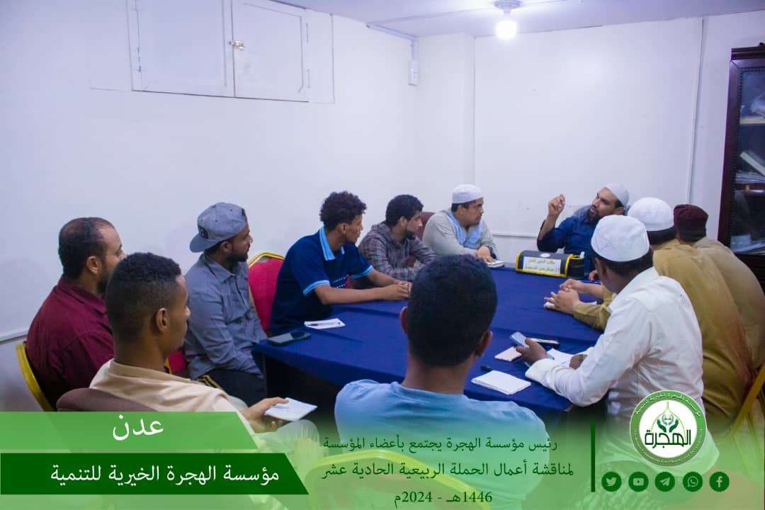 عقد رئيس مؤسسة الهجرة الخيرية للتنمية السيد عبدالرحمن المحضار يوم الثلاثاء ٢٤ محرم ١٤٤٦هـ ، الموافق 30 يوليو 2024م ، اجتماعاً لأعضاء المؤسسة بمقر مؤسسة الهجرة بالمنصورة بالعاصمة عدن .