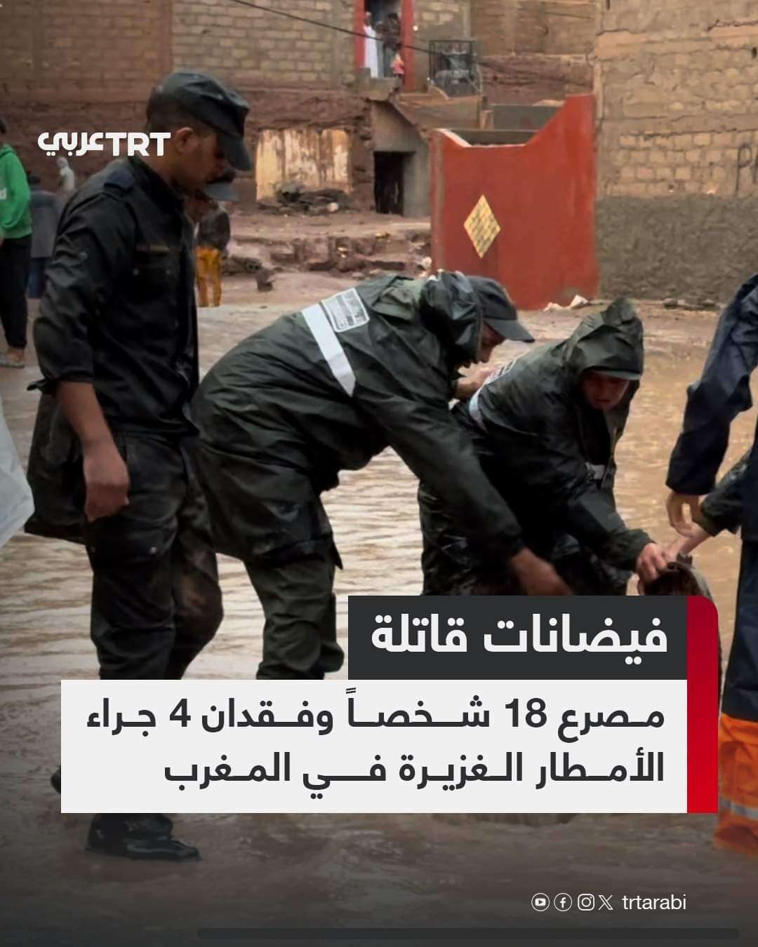 لقي 18 شخصاً في المغرب مصرعهم، ولا يزال 4 آخرون في عداد المفقودين في حصيلة أولية لضحايا فيضانات تسببت بها أمطار غزيرة على جنوبي البلاد، منذ السبت الماضي، وألحقت أضراراً مادية كبيرة على مستوى أقاليم طاطا والراشيدية وتزنيت وتنغير وتارودانت.