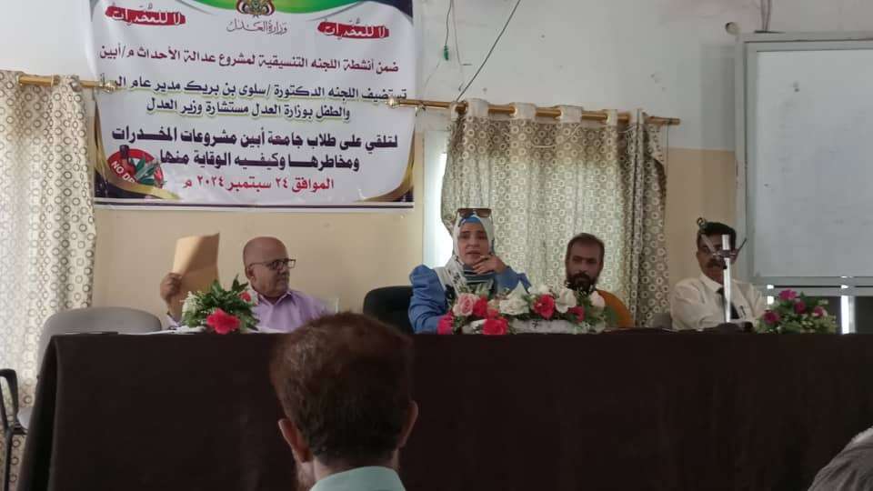 في إطار الجهود التي تبذلها اللجنة التنسيقية لمشروع عدالة الأحداث، نظمت صباح اليوم بجامعة أبين محاضرة توعوية حول المخدرات وخطرها على المجتمع.