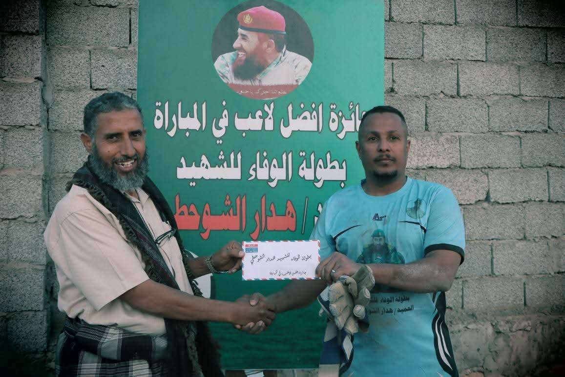 اختير افضل لاعب في المباراة حارس الوحدة زكي عبدالرقيب سلمها له الشيخ سالم الشوحطي رئيس اللجنة المشرفة على البطولة.