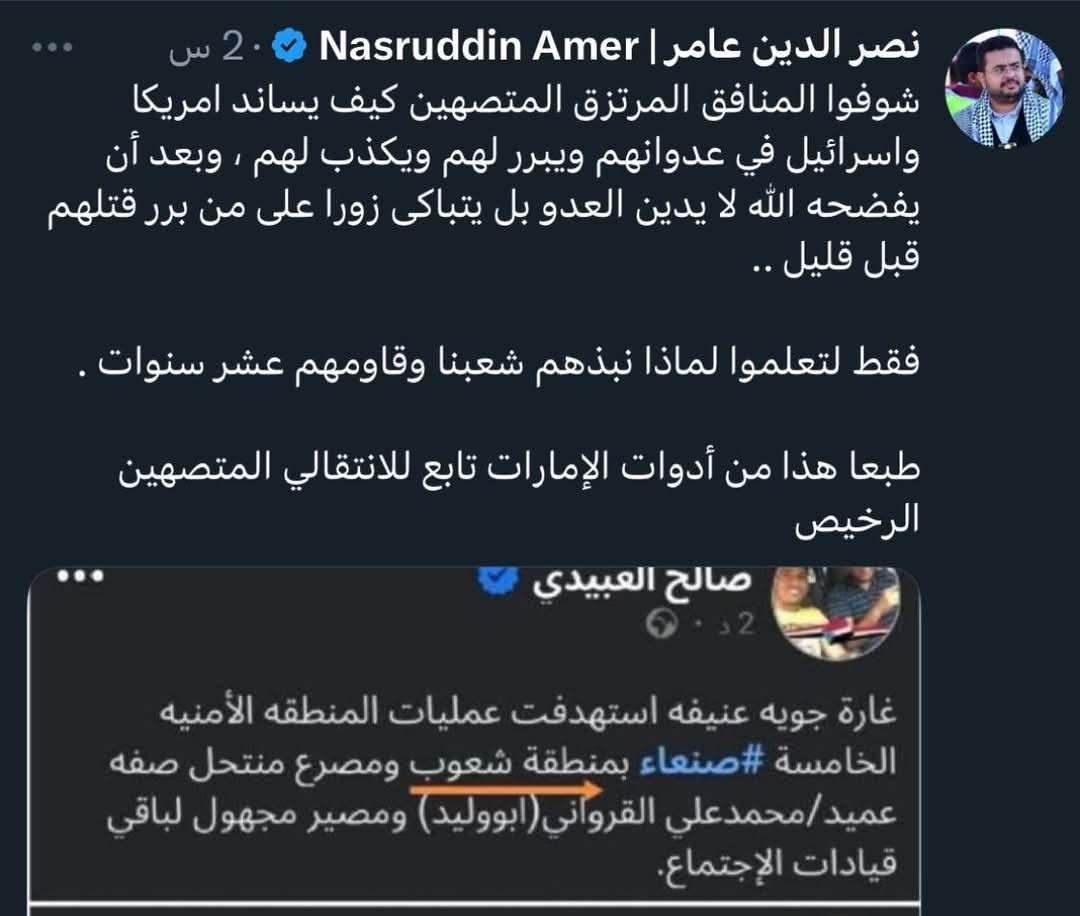 "هذا مدير وكالة سبأ الحوثية ونائب محمد عبدالسلام، نصر الدين عامر، أو كما يصفه البعض بـ(جحر الدين عامر)، يترك كل القنوات والمواقع التي تفضحهم، ويوجه تحريضه نحو الإعلامي الحر صالح العبيدي (أبو زايد العبيدي)! هؤلاء هم الوجه الآخر للإرهاب، أدوات إيران والمتاجرون بقضية الشعب اليمني والفلسطيني".