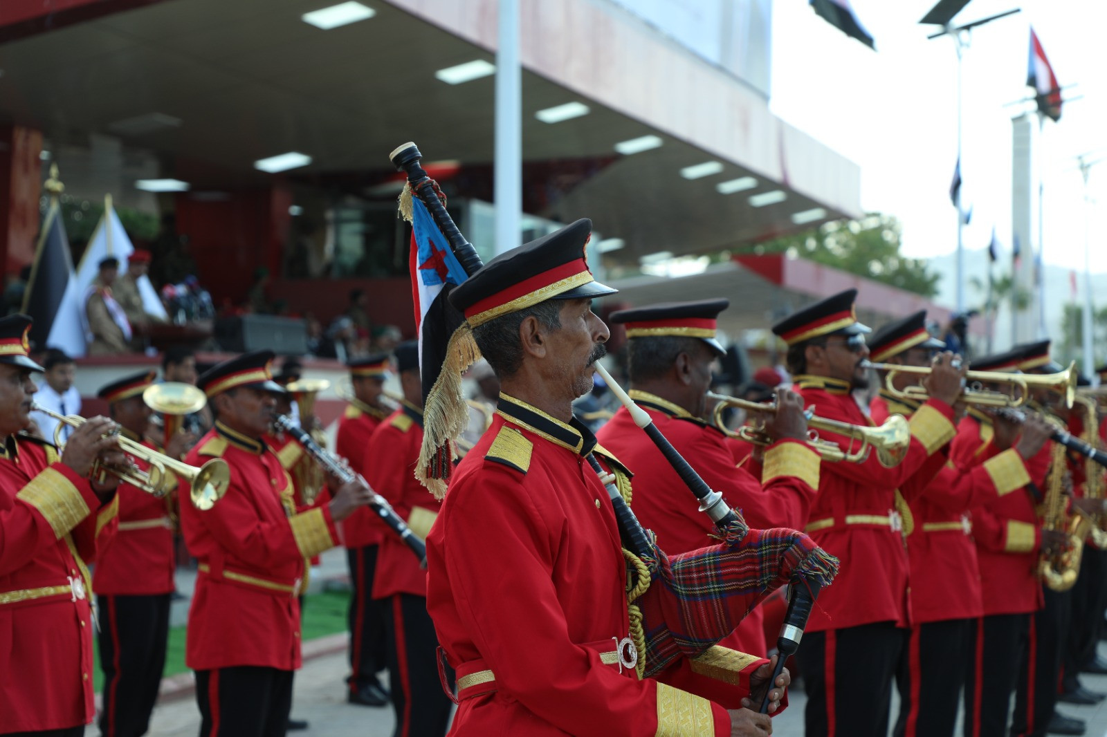 ووجّه الرئيس الزُبيدي، في مستهل العرض الذي استهل بالسلام الوطني الجنوبي، تحية عسكرية للوحدات العسكرية والأمنية المشاركة، إيذانًا بانطلاق العرض المهيب، الذي جسّد مستوى الجاهزية العالية والانضباط القتالي والمهني للقوات المسلحة الجنوبية، وعكس ما تحققه من تطور في البناء والتنظيم والانضباط.