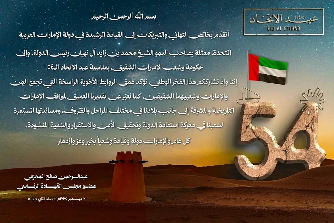 إننا وإذ نشارككم هذا الفخر الوطني، نؤكد عمق الروابط الأخوية الراسخة التي تجمع اليمن والإمارات وشعبيهما الشقيقين. كما نعبّر عن تقديرنا العميق لمواقف الإمارات التاريخية والمشرّفة إلى جانب بلادنا في مختلف المراحل والظروف، ومساندتها المستمرة لشعبنا في معركة استعادة الدولة وتحقيق الأمن والاستقرار والتنمية المنشودة.