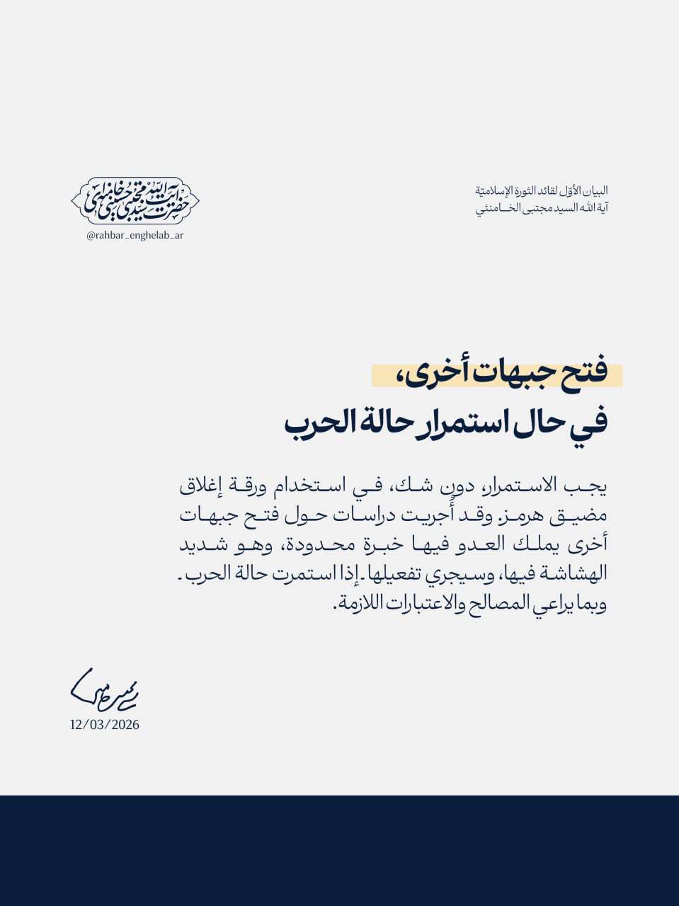 وقال الخامنئي في البيان الأول الصادر عنه بتاريخ 12 مارس 2026، إن استمرار الحرب قد يدفع إلى تفعيل خيارات استراتيجية جديدة، من بينها استخدام ورقة إغلاق مضيق هرمز، الذي يعد أحد أهم الممرات المائية لنقل الطاقة في العالم.