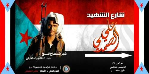 وسيدشين رسميآ وإداريآ تسمية شارع المطار باسم شارع الشهيد علي الصمدي رحمه الله وسيتم رفع أكبر صورة له في خور مكسر مكان استشهاد .