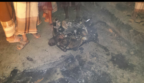 حيث كانت الدراجة تسير في الخط الأسفلتي عندما تعرضت للقصف بالقرب من منطقة سكنية وأدى القصف إلى اشتعال الدراجة النارية نوع سانيا وتناثرت جثة سائقها إلى أشلاء وحتى اللحظة لم يتم التعرف عليها حيث كان يحمل على الدراجة أعلاف أغنام.