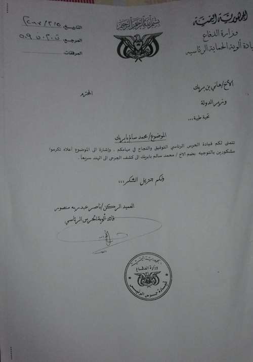 من جهته وفي إفادة للمصاب بابريك قال: "إن لديه توجيهات واضحة وصريحة مقدمة من العميد الركن ناصر عبدربه منصور هادي قائد ألوية الحرس الرئاسي قضت بضرورة نقله إلى دولة الهند بشكل عاجل للعلاج قبل أن تسوء حالته".