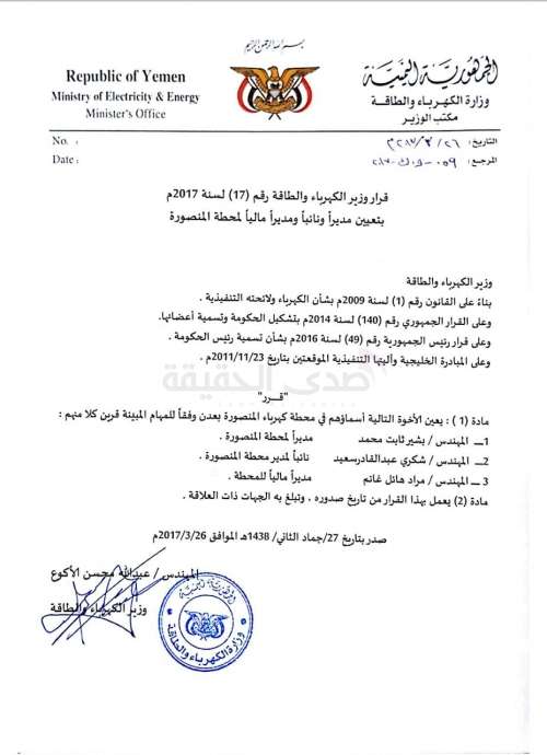 أصدر الأخ المهندس عبدالله محسن الأكوع وزير الكهرباء والطاقة قرار بتعيين مدير ونائب للمدير ومدير مالي لمحطة المنصورة بعدن.